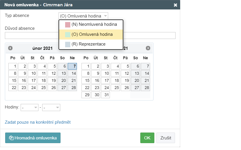 Termín musí být zadán od-do. Při absenci jednoho dne klikněte na stejné datum. Pokud žák chyběl celý den, hodiny označovat nemusíte.